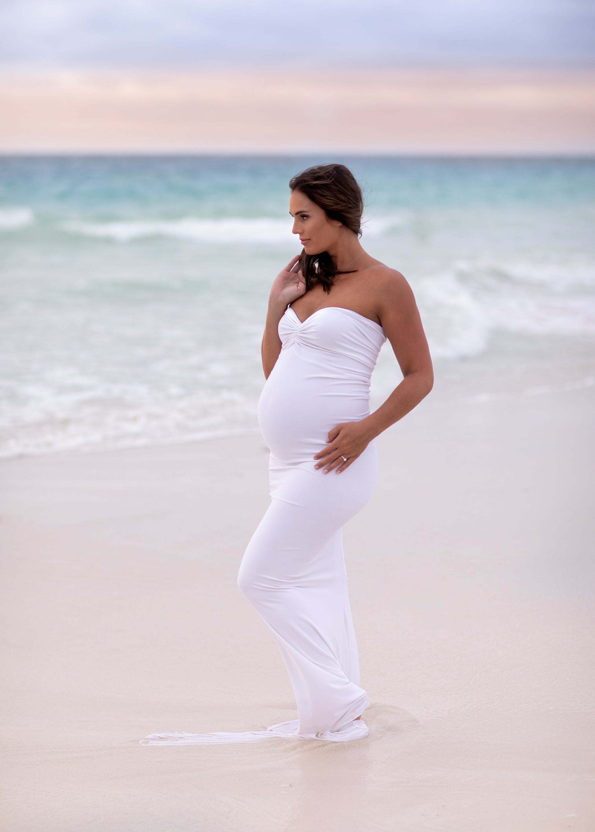 The Oasis gown is a timeless and classic maternity dress style that can be worn on its own or layered with other pieces. Strapless and fitted with a flowing train and a gathered bodice detail giving it a beautifully supportive bust. Finished with a train in the back.