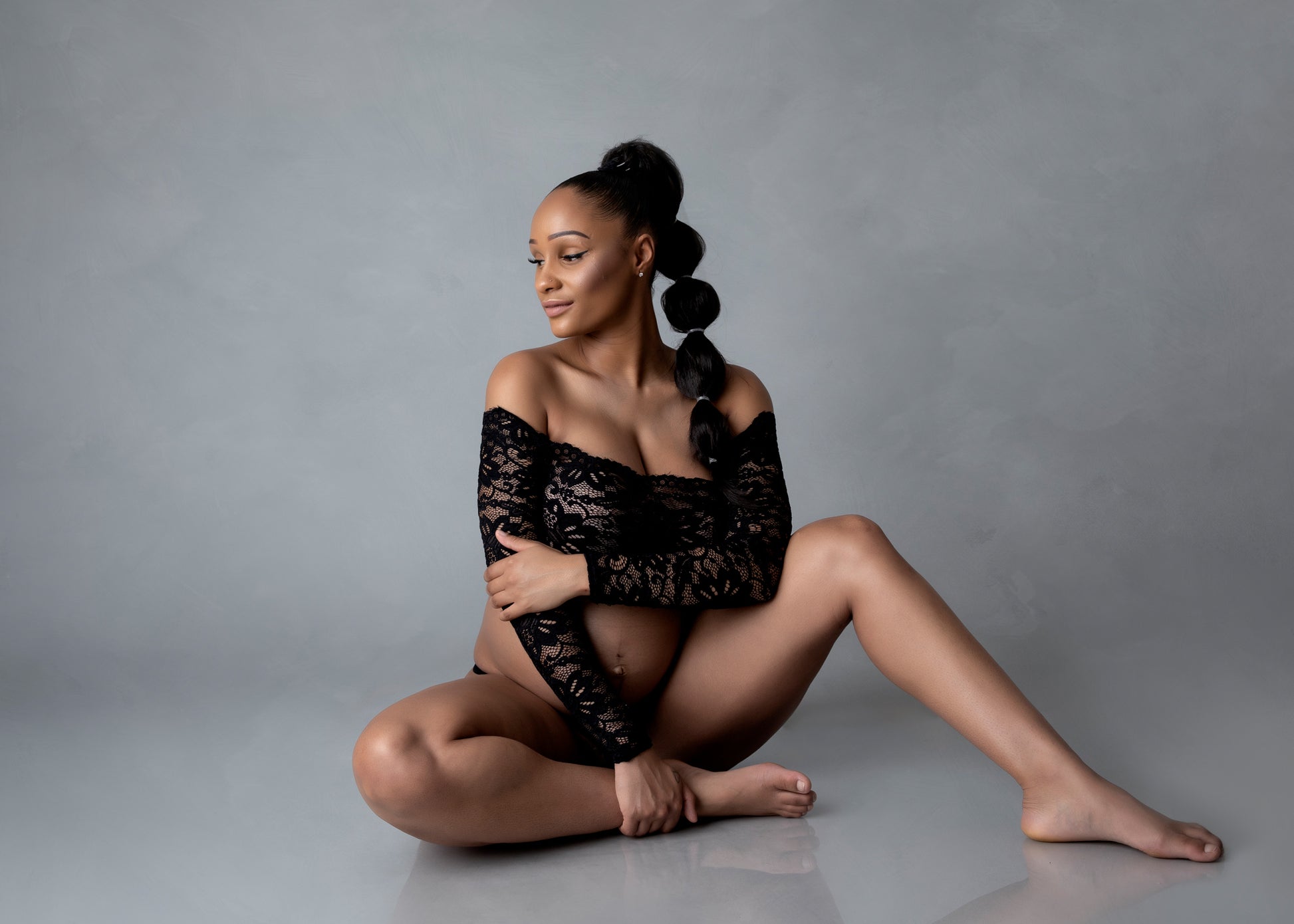 Made from soft stretch lace, this top is a stunning piece for any maternity shoot and can be worn with a skirt, over a gown or on its own. With scalloped top edging and off the shoulder sleeves, it is a flattering and stunning piece for anyone.