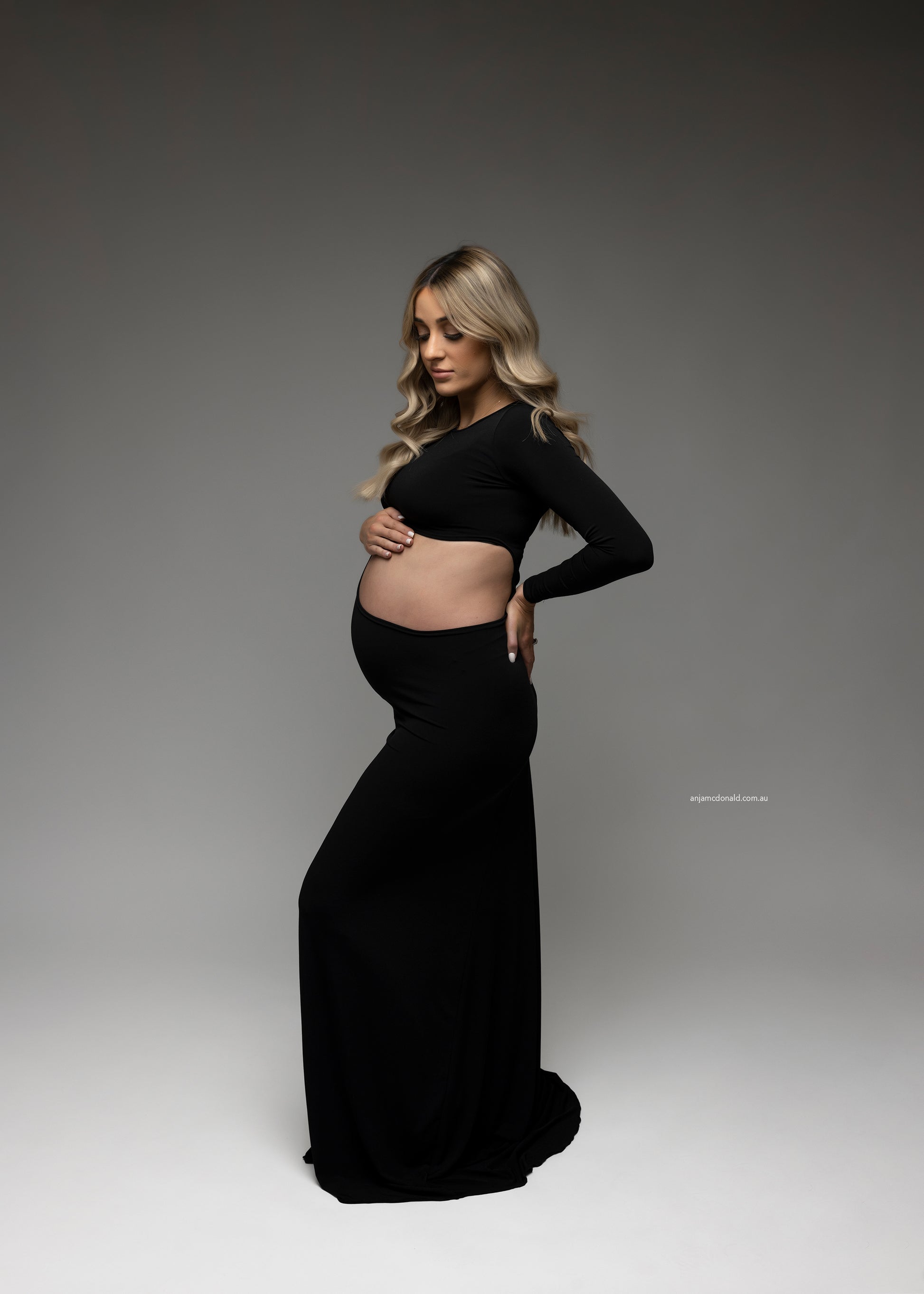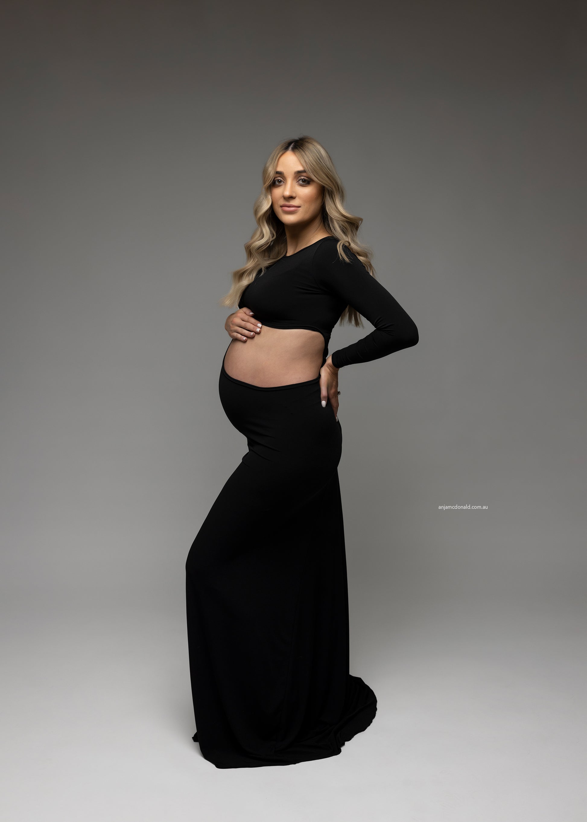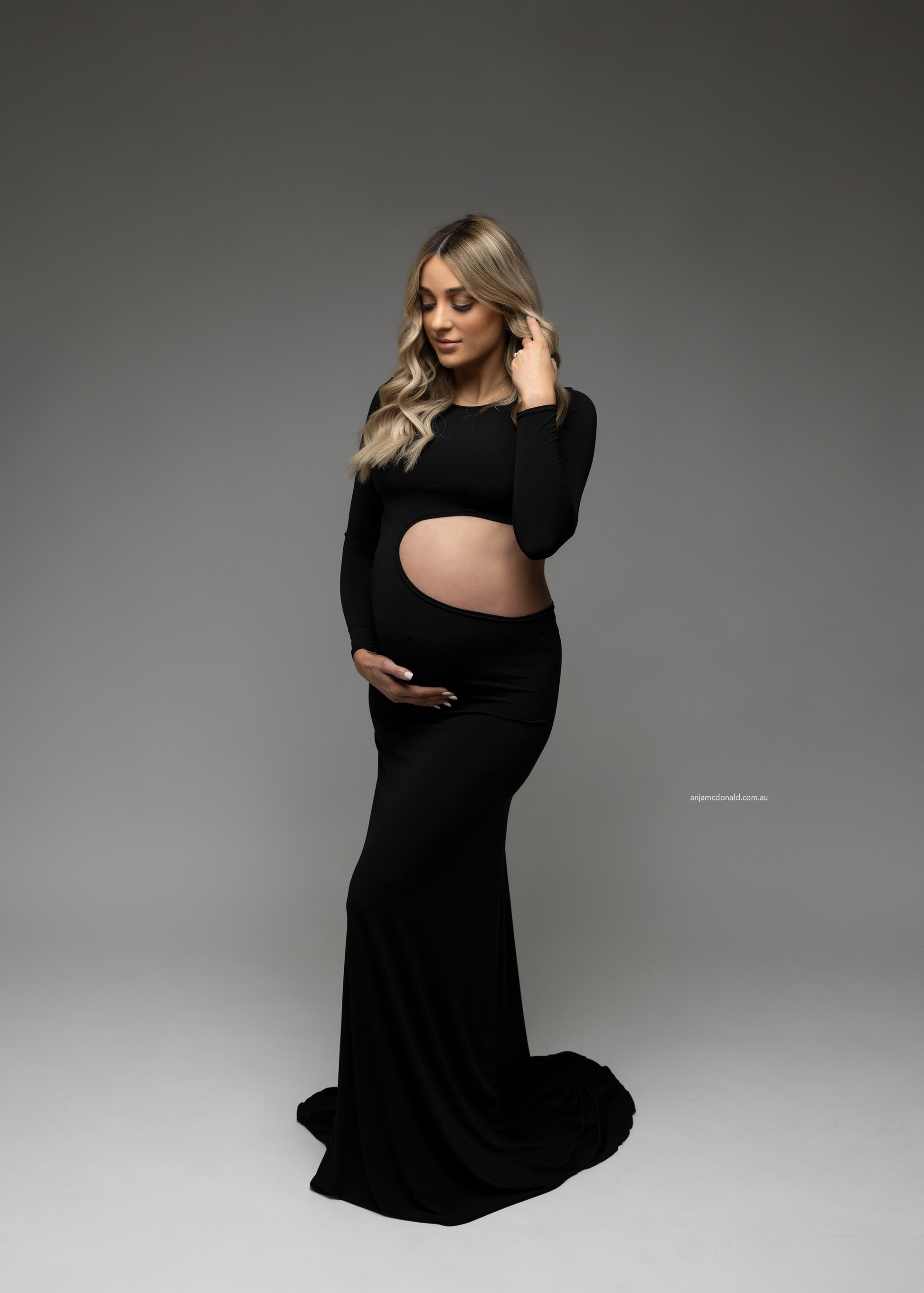 The Venus maternity gown is an elegant and flattering with a feature belly cut-out. It has a scoop neck, long sleeves and is finished with a train in the back providing that gorgeous floaty look. This gown is a very dark navy colour.